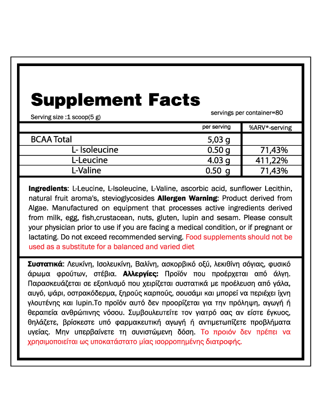 Τα BCAA (αμινοξέα διακλαδισμένης αλυσίδας) είναι απαραίτητα θρεπτικά συστατικά για το σώμα και σύμφωνα με έρευνες η πρόσληψη BCAA μπορεί να προάγει ένα αναβολικό ορμονικό προφίλ (προκαλώντας την αποκατάσταση των μυών μετά την προπόνηση) και μειώνοντας την πιθανότητα της μυϊκής βλάβης κατά τη διάρκεια της άσκησης.