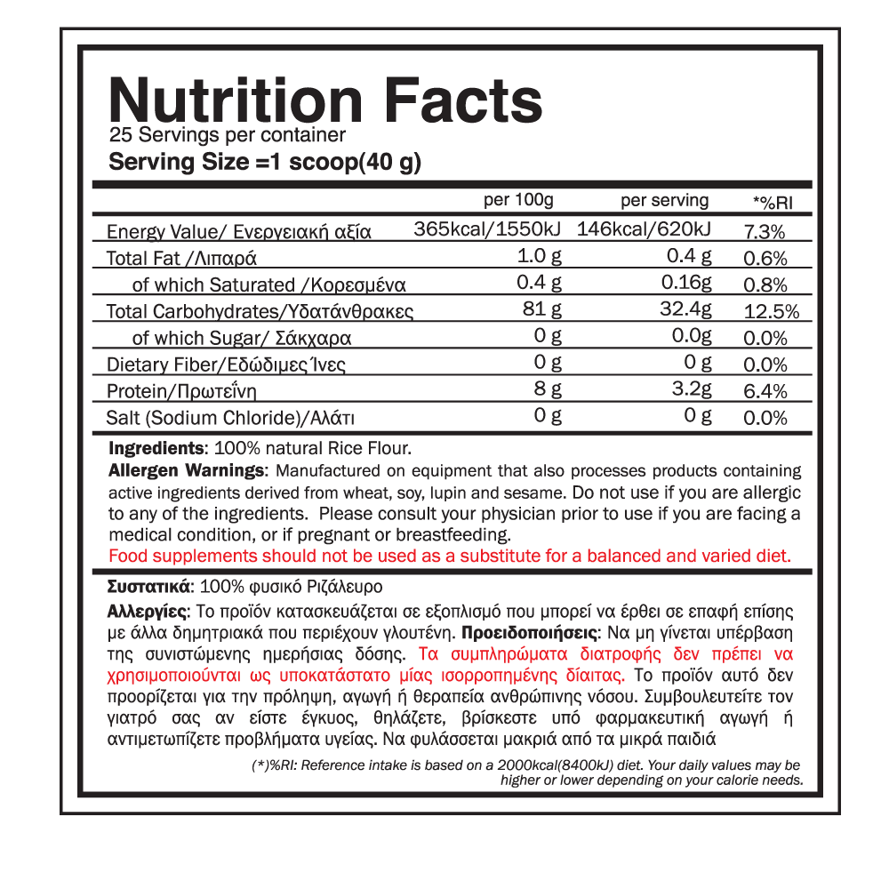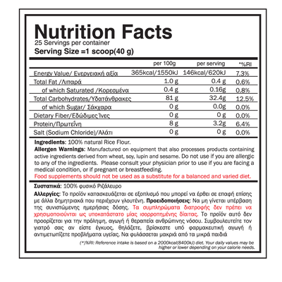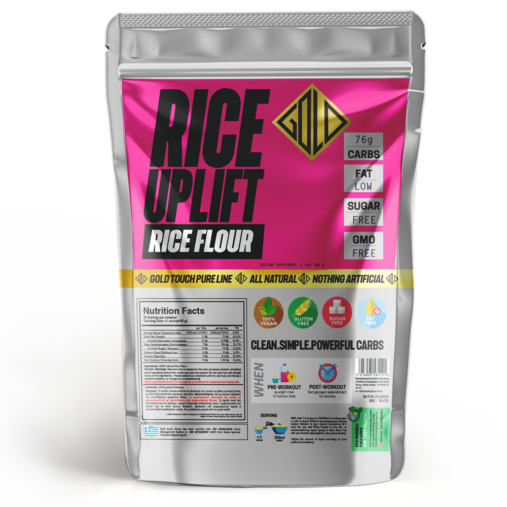 Το Rice UpLift είναι ένα κορυφαίο συμπλήρωμα υδατανθράκων, φτιαγμένο από 100% καθαρό ρύζι. Αποτελεί μια πλούσια αλλά και φυσική πηγή ενέργειας, καθώς περιέχει 30g υδατανθράκων ανά μερίδα, ενώ δεν περιέχει καθόλου γεύση, πρόσθετα ή συντηρητικά. Είναι κατάλληλο για φυτοφάγους και άτομα που αποφεύγουν τη γλουτένη.