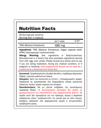 TMG Betaine Anhydrous(680mg) -90 caps No Fillers- Gold Touch Nutrition