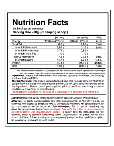 • Σας δίνει 24g πρωτεΐνης ορού γάλακτος/ scoop