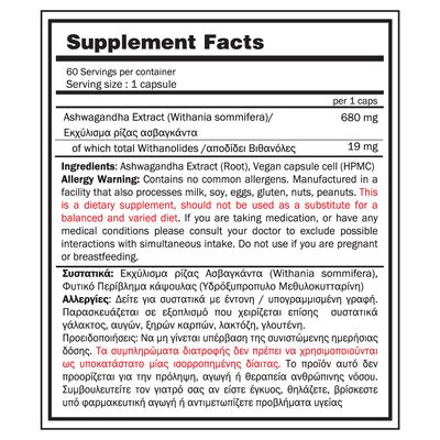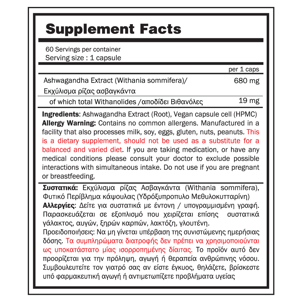 H Ashwagandha (Withania somnifera) είναι ένα φυσικό βότανο με ισχυρή αντιοξειδωτική και προσαρμοσιογόνο δράση, το οποίο χρησιμοποιείται εδώ και αιώνες στην Αγιουρβεδική ιατρική. Η φόρμουλά μας παρέχει 680 mg εκχυλίσματος ρίζας Ashwagandha ανά κάψουλα, τυποποιημένη ώστε να περιέχει 19 mg withanolides, τις κύριες δραστικές ενώσεις του φυτού, για στοχευμένη δράση, στην υποστήριξη της σωματικής και ψυχικής αντοχής.