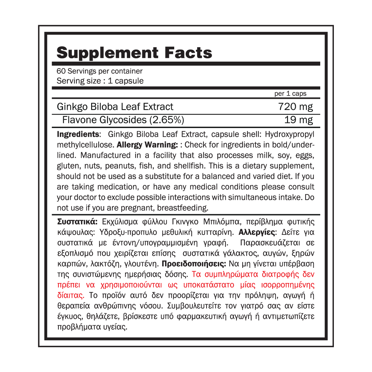To Ginkgo Biloba είναι εκχύλισμα από τα φύλλα του δέντρου Ginkgo, που παραδοσιακά χρησιμοποιείται εδώ και αιώνες για την υποστήριξη της πνευματικής διαύγειας και της κυκλοφορίας του αίματος. H φόρμουλα της GoldTouch Nutrition περιέχει εκχύλισμα gingko 720 mg, τυποποιημένο σε 19 mg φλαβονογλυκοσίδες ανά κάψουλα. Είναι μια καθαρή σύνθεση που περιέχει μόνο το δραστικό συστατικό, χωρίς άλλα πρόσθετα, σε μια vegan κάψουλα.